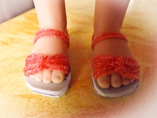 paire de sandalettes orange. Le tout créés par mes soins.